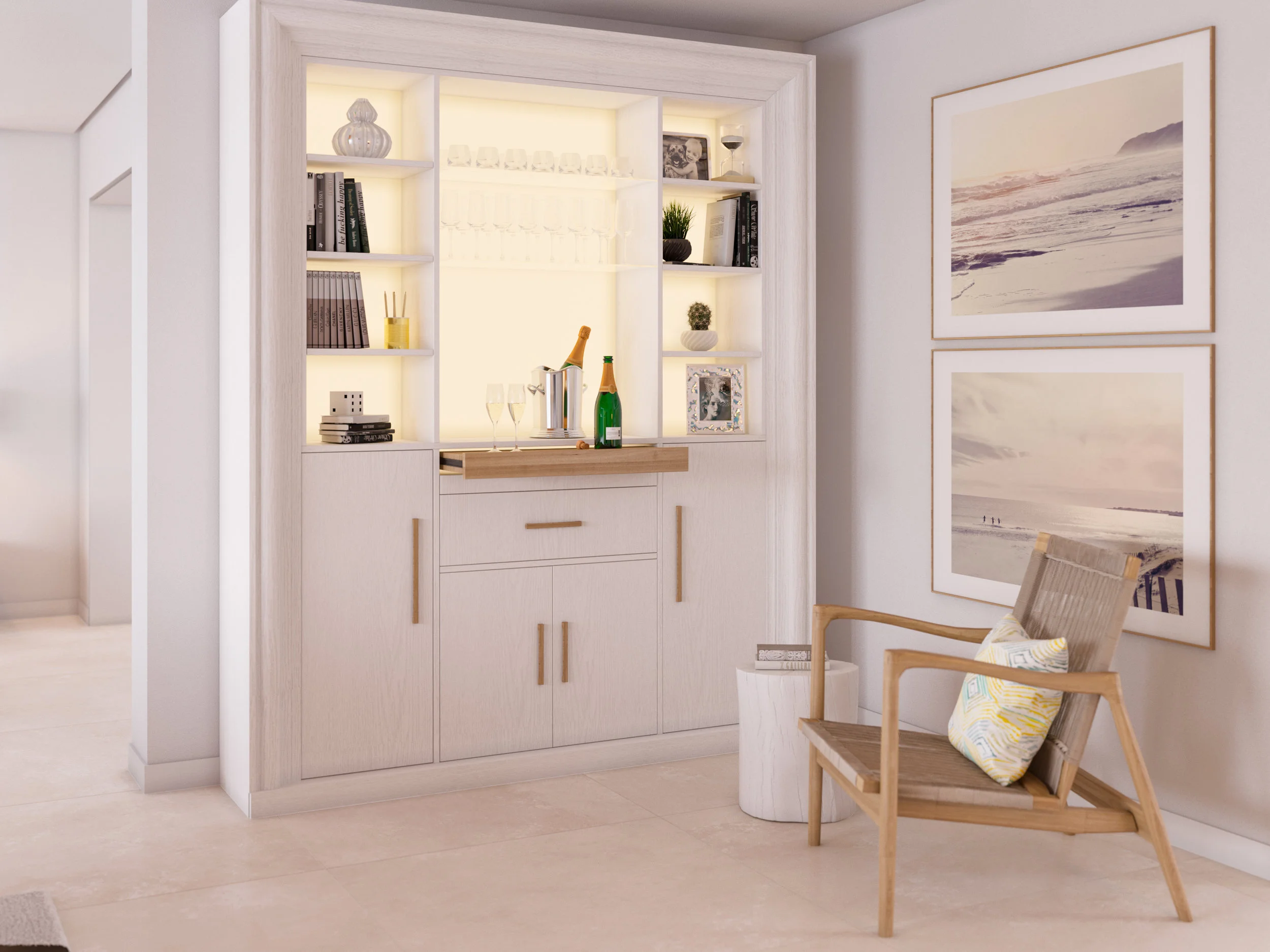 The following area is a corner we created where one can have a drink or read a book. Back lit shelving with a sliding wooden tray for bottles and serving, making it very practical and easy for your guests to sip on a nice bourbon whilst enjoying the nice garden view.