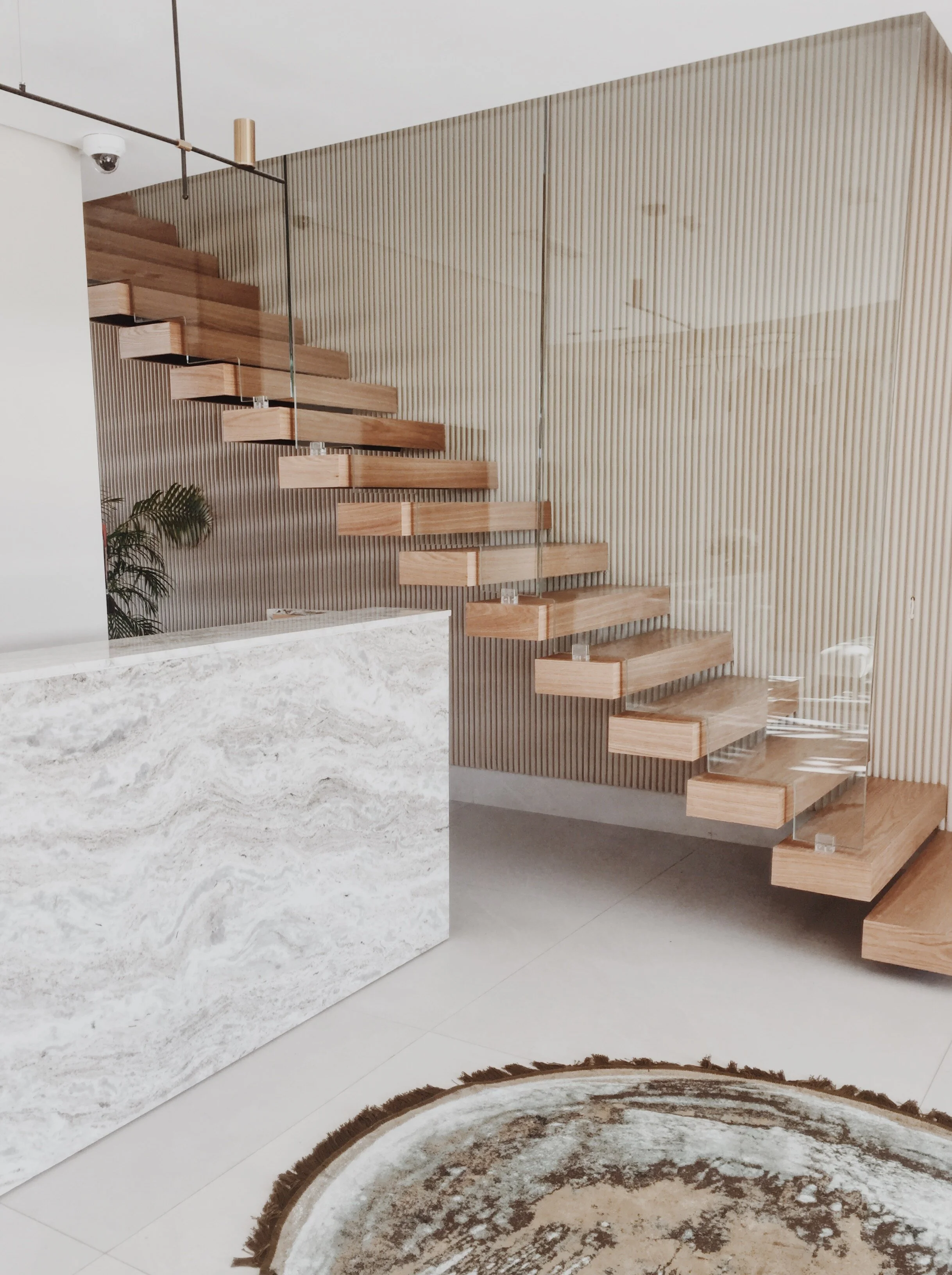 We wanted to incorporate the beautiful fantasy brown marble originally from India, combining it with the oak wooden suspended stairs and a simple tube molding to create a soft and refined entrance.