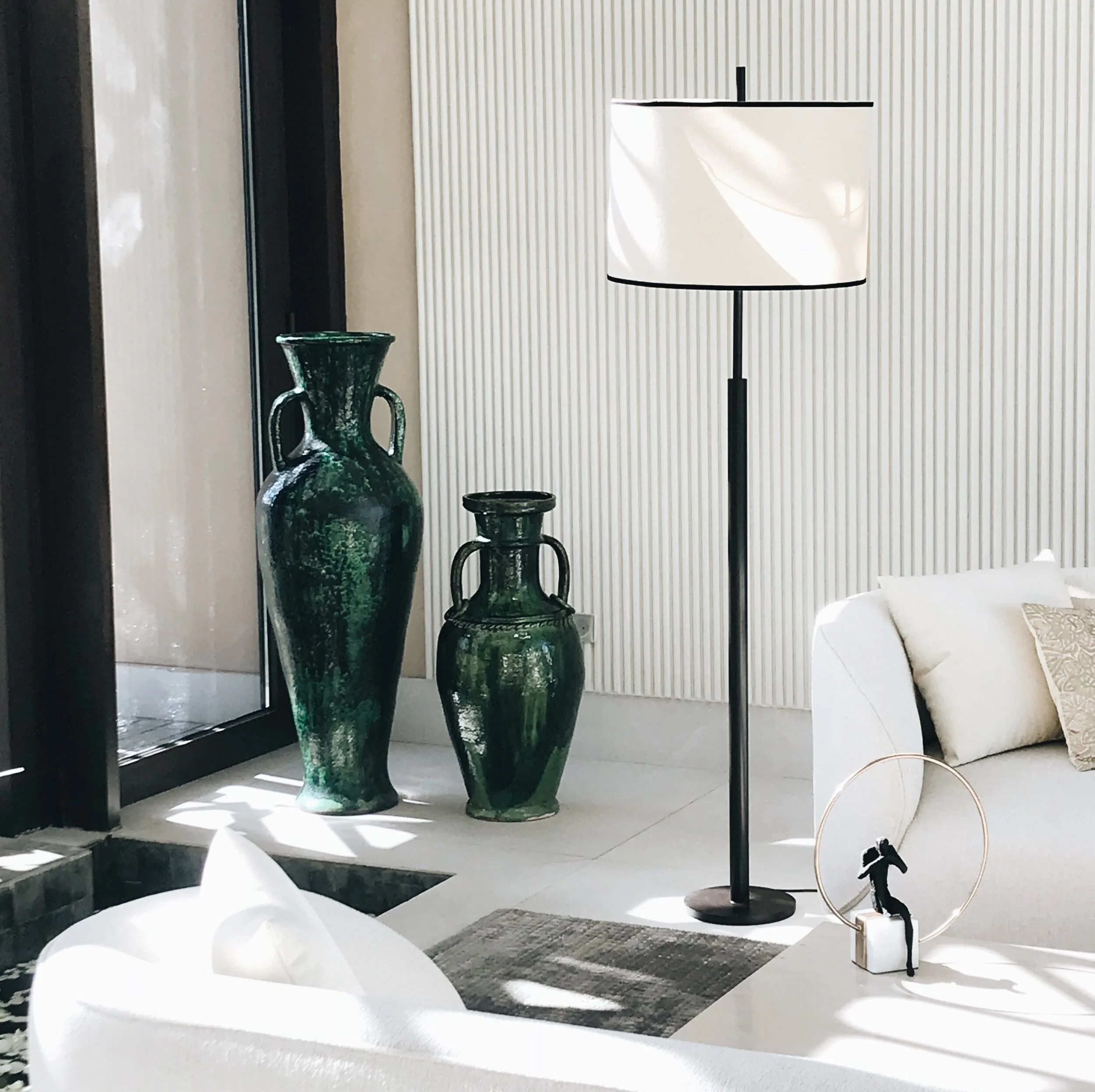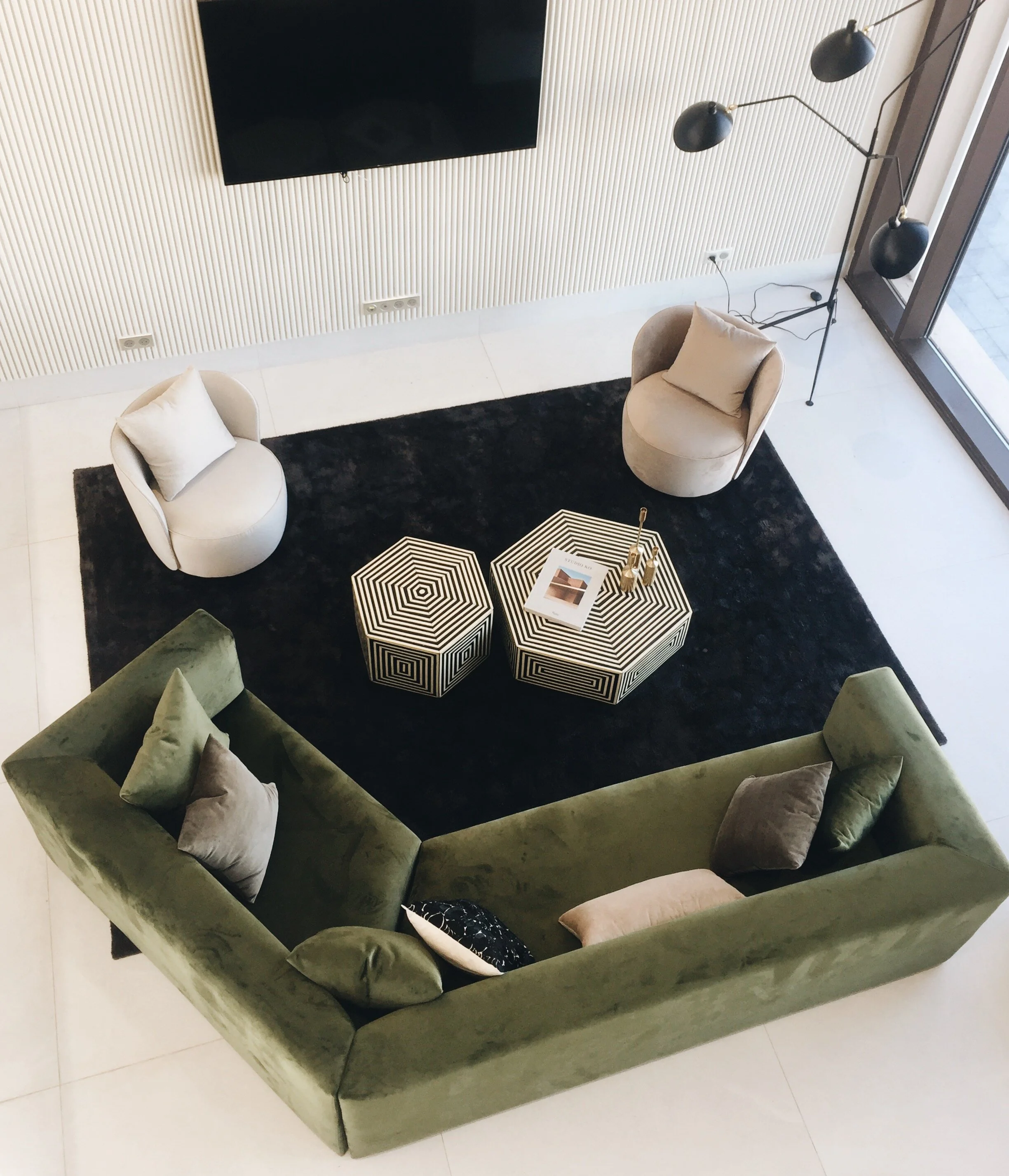 To continue in the black and white lined spirit, we placed floor lamps on every corner of the reception to create a nice warm lighting around the reception, and designed the two piece coffee table to match the rest of the area. We also incorporated the green tamegroute artisanal pots in some corners to give the identity and personality to the space.