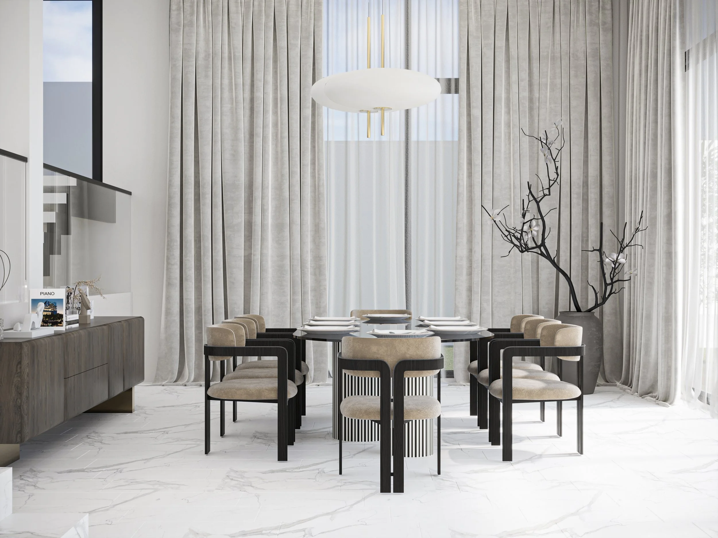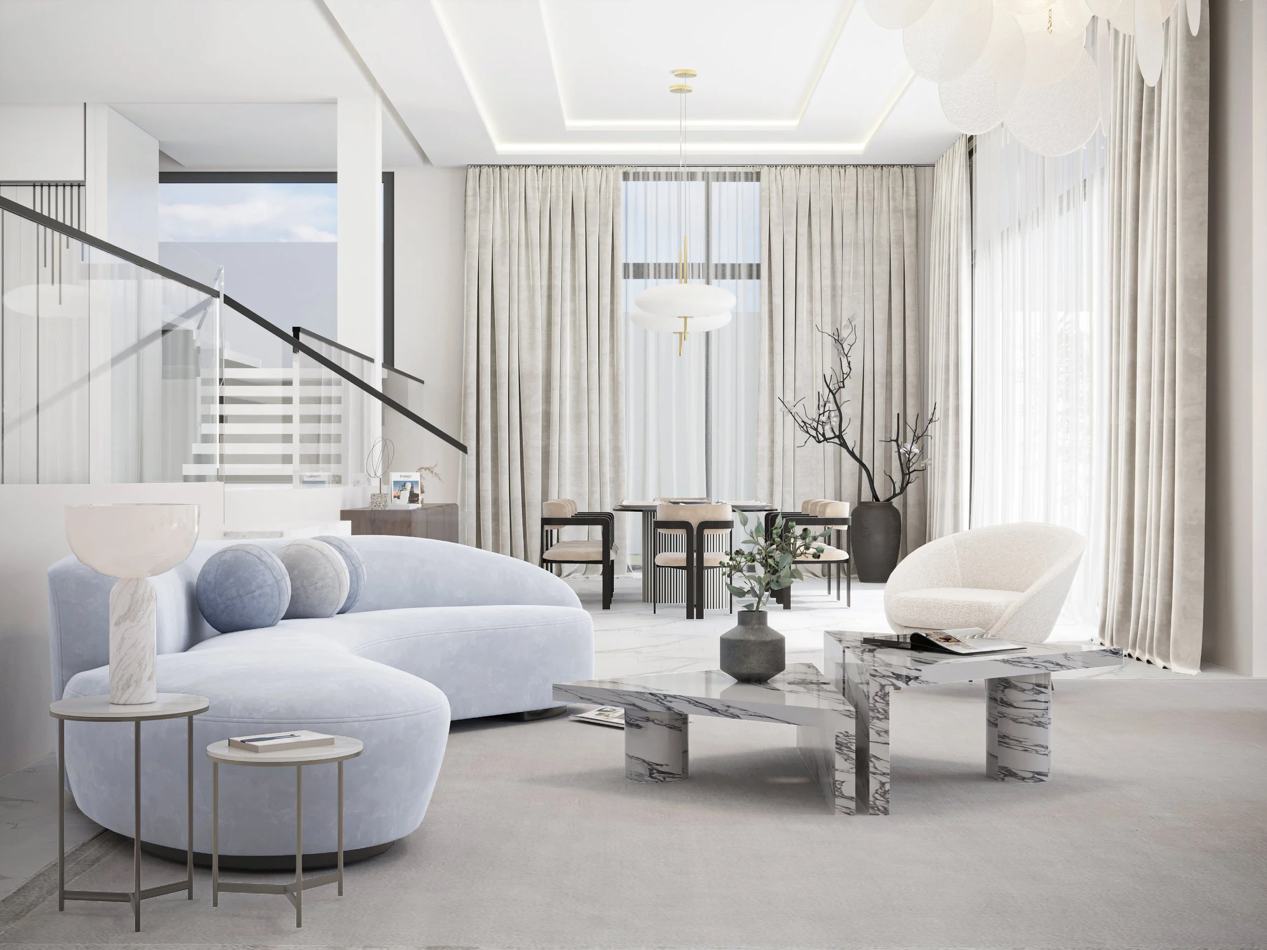 As you step inside this beautifully designed home, you're greeted by a sense of modern elegance and warmth. The overall theme is sleek and minimalist, with a focus on clean lines, neutral colors, and functional spaces. The furniture is a mix of modern and mid-century styles.