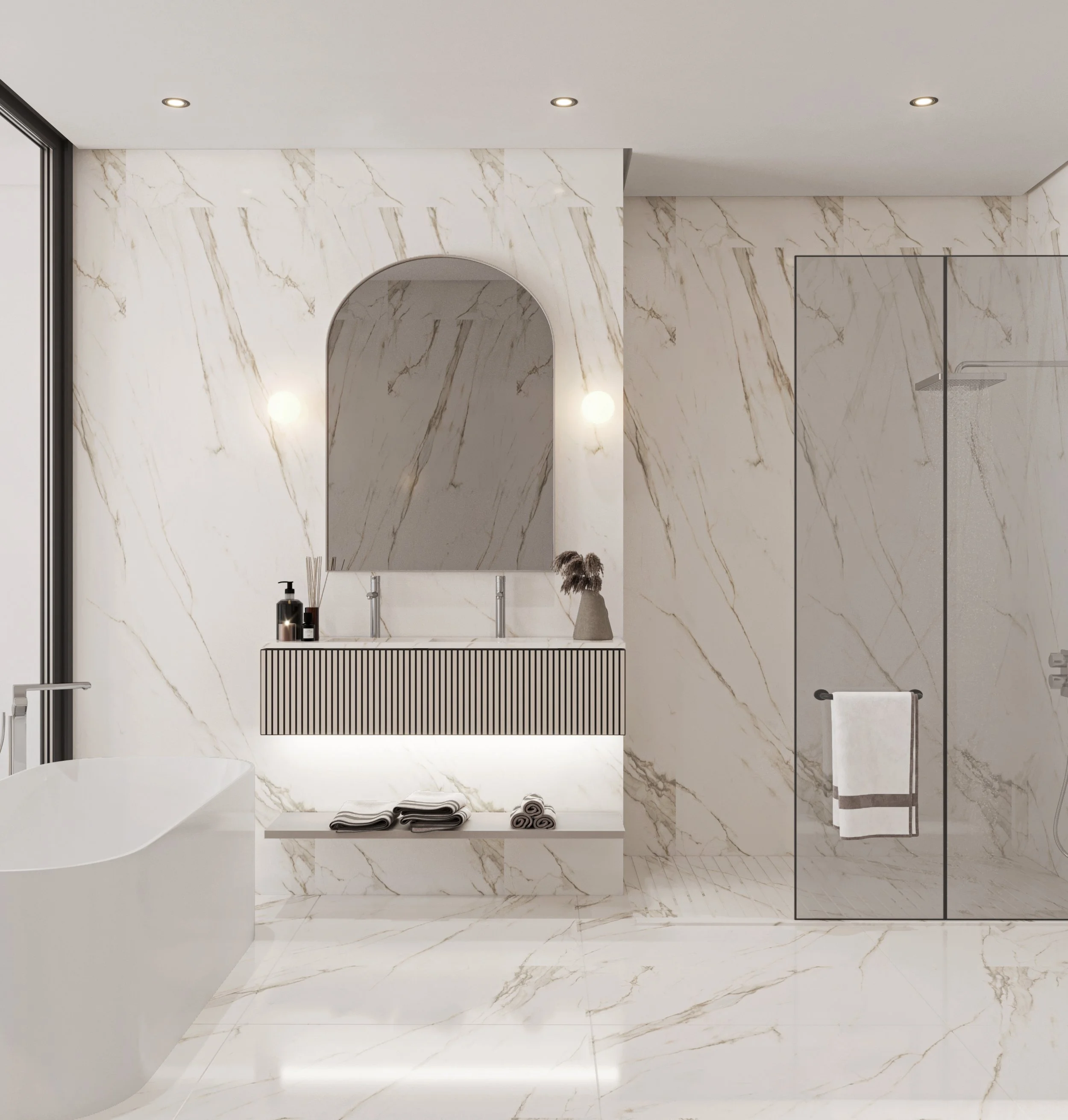 The bathroom exudes luxury and relaxation. Marble tiles adorn the walls and floor, while the glass shower enclosure adds a touch of modernity. A freestanding bathtub sits under a large window, allowing the homeowner to indulge in relaxing baths while enjoying natural light from the outdoors.